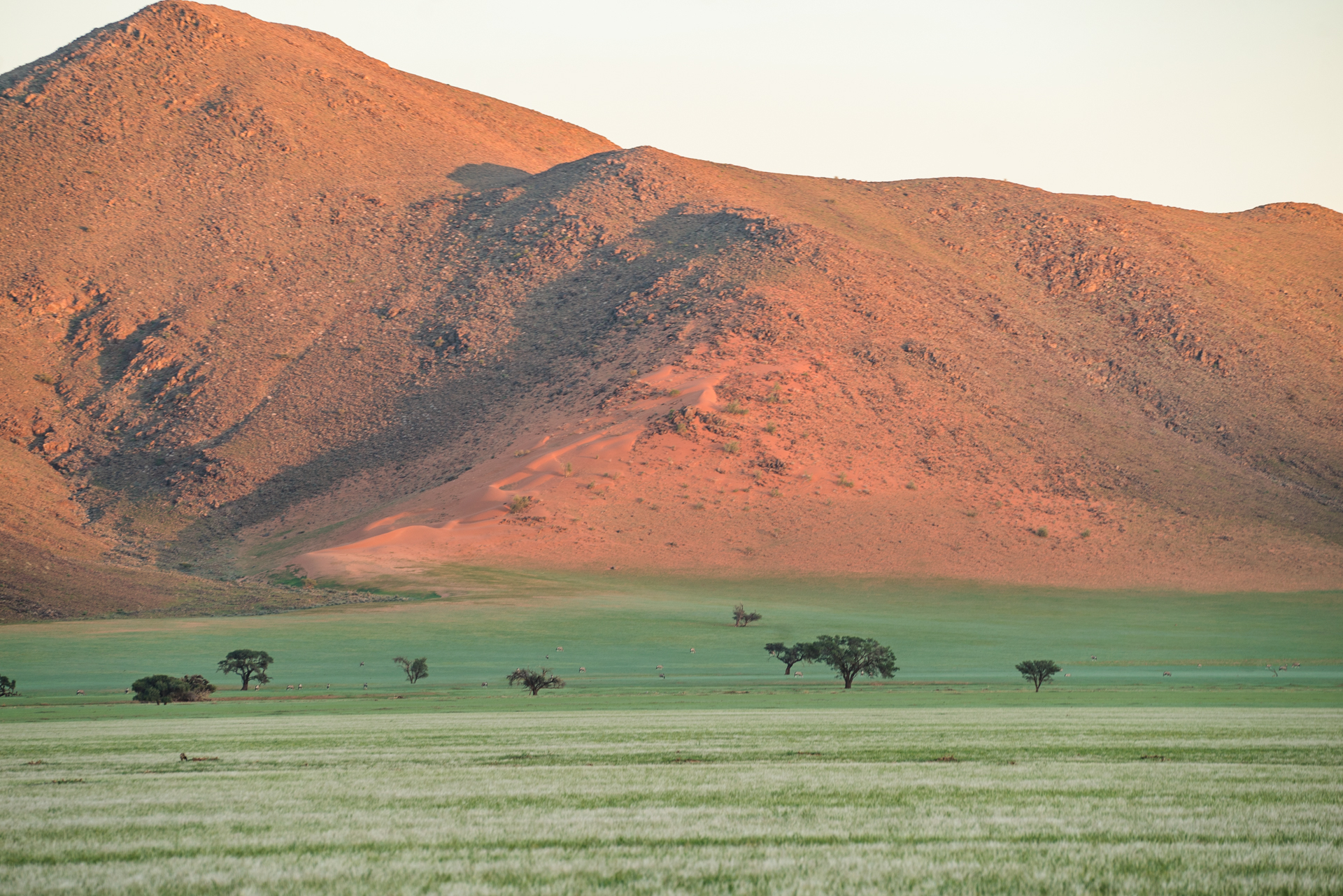 Dere starter dagen tidlig for å nå Namib Naukluft nasjonalpark og sanddynene i Sossusvlei så tidlig som mulig. Her møtes den klare blå himmelen og de røde sanddynene, noe som gjør dette til et av Afrikas vakreste underverk og fotografers drøm. De mest berømte sanddynene i området heter Dune 45, Big Daddy (ligger rett ved Dead Vlei) og Big Mama. For de av dere som leter etter en tøff utfordring er det muligheter til å inspisere en av disse. Deretter besøker dere Deadvlei hvor Namibias mest fotograferte trær finnes. Dere kommer deretter tilbake til lodgen etter fantastiske opplevelser i Namib Naukluft park.