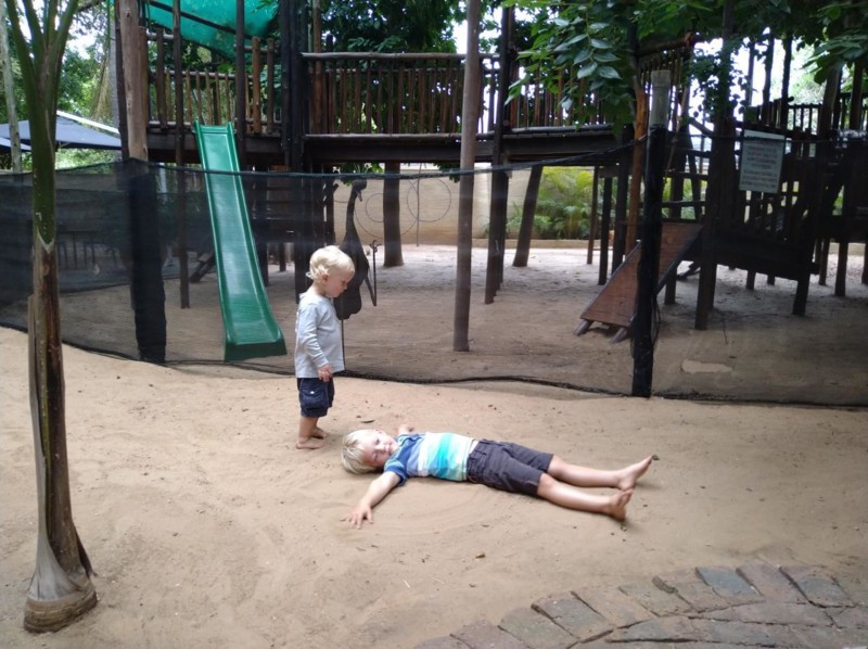 Vi våknet til en varm og solrik dag. Olli og Ola badet lenge om morgenen. Deretter dro vi til Sanitas Garden, et sted Olli hadde funnet som skulle være barnevennlig med en lekeplass. Da vi kom dit, viste det seg til barnas store skuffelse at hele den fine lekeplassen var stengt på grunn av korona. Vi spiste likevel en god, hjemmelaget lunsj og fikk sjansen til å hilse på den svenske kvinnen som sammen med mannen sin åpnet hagesenteret allerede på 80-tallet. Hun husket godt Markus' besteforeldre. For Markus var det ekstra morsomt å besøke steder der besteforeldrene hans hadde bodd. Ola hadde en stund snakket om at han ville klippe håret. Da vi var ute i villmarken, sa vi til ham at vi måtte komme til en by der det var en frisør. Så nå var det på tide, tenkte vi. Vi gikk til en frisørsalong, og på bare noen minutter var Ola klippet kort. Han så så fornøyd og stolt ut etterpå og ville gjerne se seg i speilet. På vei tilbake begynte det å regne kraftig, og veien ble dekket av vann. Ola syntes det ble som en elv.