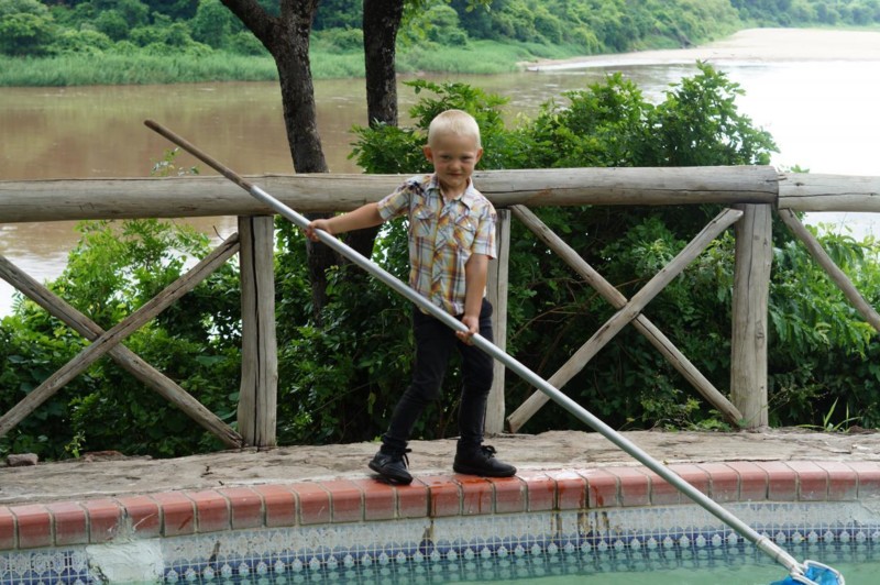 Vi feiret jul og nyttår i Zimbabwe før reisen fortsatte til Zambia. Det har vært litt spesielt hver gang vi har krysset en landegrense og bare noen minutter senere har kommet til et nytt land. Fra Zimbabwe krysset vi en bro over Victoriafallene for å komme til Zambia, det var en imponerende opplevelse. Vi startet oppholdet i Zambia med fire netter på Tabonina guesthouse i Livingstone. Der hadde vi noen virkelig fine og avslappende dager. Gjestehuset hadde en stor, frodig hage og et basseng. Vi var de eneste gjestene, så barna hadde stor frihet til å bevege seg og leke. De ble gode venner med Lenzi, gjestehusets gartner og altmuligmann. Barna fulgte ham rundt og plantet nye planter, beskar busker, plukket mango osv. I mellomtiden kunne Markus og jeg drikke kaffe og slappe av litt. Vi tok noen turer inn til byen for lunsj og litt shopping. Blant annet spiste vi lunsj på Dacanton og fikk smake på landets beste italienske iskrem. Vi spiste også lunsj på Zest, en av de mer populære restaurantene i Livingston. Vi kjøpte noen gaver på et marked og klær i en bruktbutikk tilsvarende Erikshjälpen i Sverige. En ettermiddag dro vi og så på hotellene og lodgene i området.