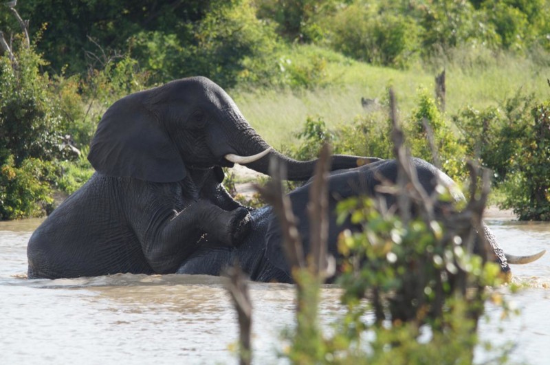 Vi forlot Victoria Falls i kraftig regnvær, og etter knappe tre timer var vi fremme ved vår lodge, Elefant Eye. Vi ble ønsket velkommen med en forfriskende drink. Elefant Eye er en veldig hyggelig camp med bare 8 eksklusive telt. Ola var glad for å komme til et nytt overnattingssted med basseng. Vi badet før lunsj, og etterpå slappet vi av i teltet vårt. Vi prøvde utendørsdusjen, det er noe spesielt med å dusje utendørs i naturen. Hwange National Park er en av Zimbabwes mest kjente parker og dekker et område på 14,651 km2. I Hwange lever over 100 forskjellige pattedyrarter, og over 400 forskjellige fuglearter er observert i parken. Etter en hyggelig lunsj ventet ettermiddagssafari. Vi så elefanter som kjølte seg ned i et vannhull. I skumringen stoppet vi for en sundowner, ikke langt unna beitet sebraer, gnuer og antiloper. Det ble mørkt på vei tilbake, så det var ekstra spennende å se etter lysende øyne i busken. Vi så giraffer, og også ildfluer som blinket i mørket. Når vi kom tilbake til lodgen, var bålet tent, og vi spiste en god middag med manageren og hans familie. Vi sov alle godt i en veldig bred seng.