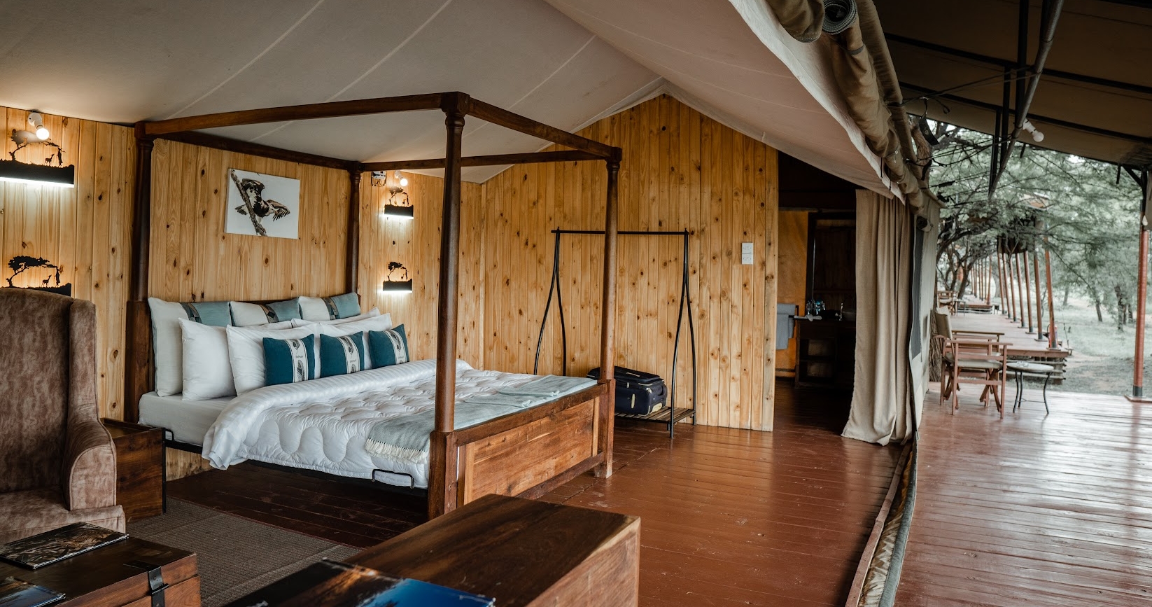 De store, romslige og elegante teltene er bygget på treplattformer. I tillegg til komfortable senger og bad, er det også utendørs dusj. Alle teltene har en stor og romslig veranda, hvor du kan se utover Serengetis uendelige sletter.