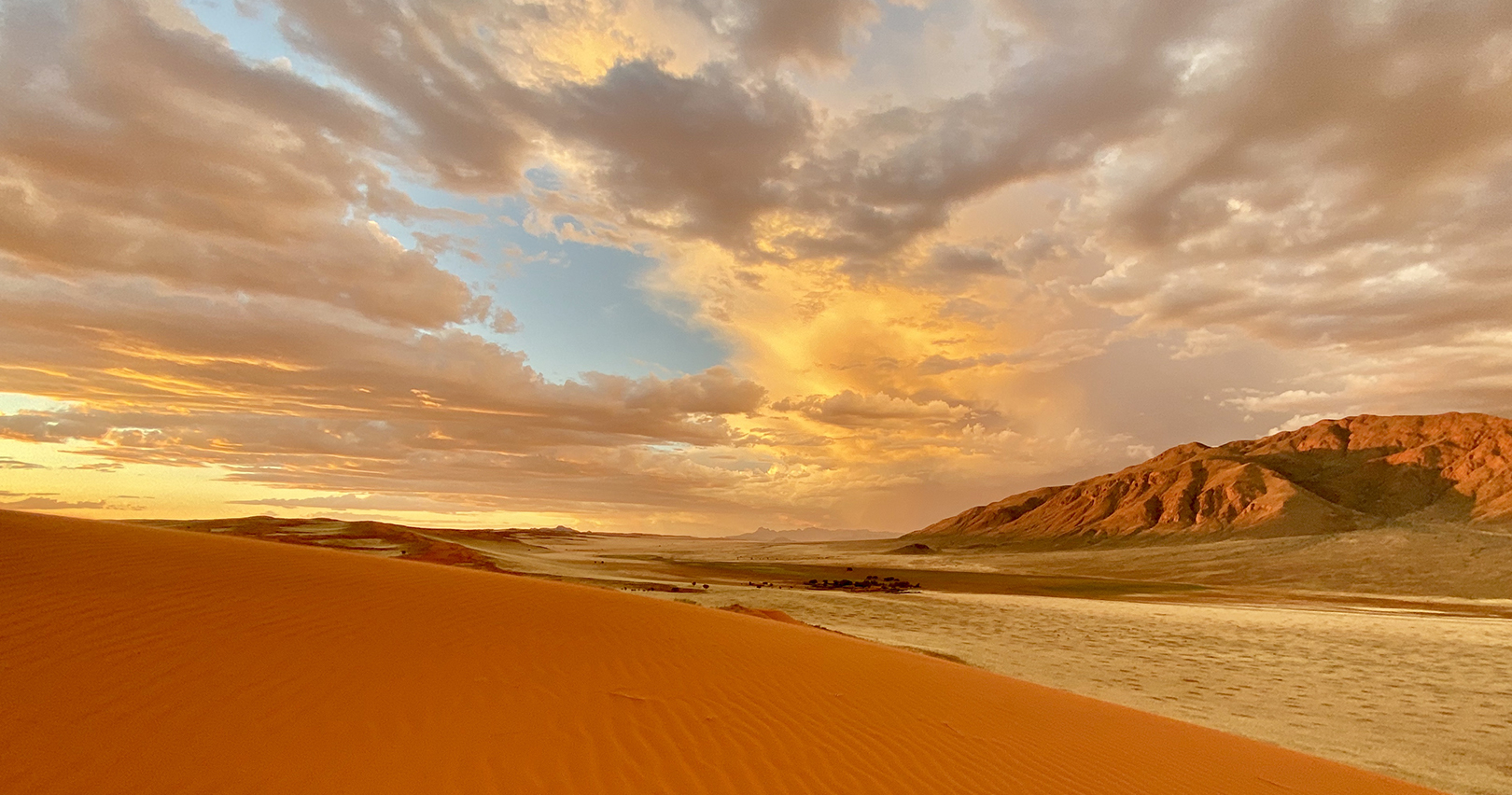 Wolwedans Dune Camp er en eksklusiv og avsidesliggende destinasjon beliggende på kanten av en 250 meter høy sanddyne i NamibRand naturreservat. Med sin unike plassering tilbyr campen enestående utsikt over ørkenen og fjellene i det fjerne.