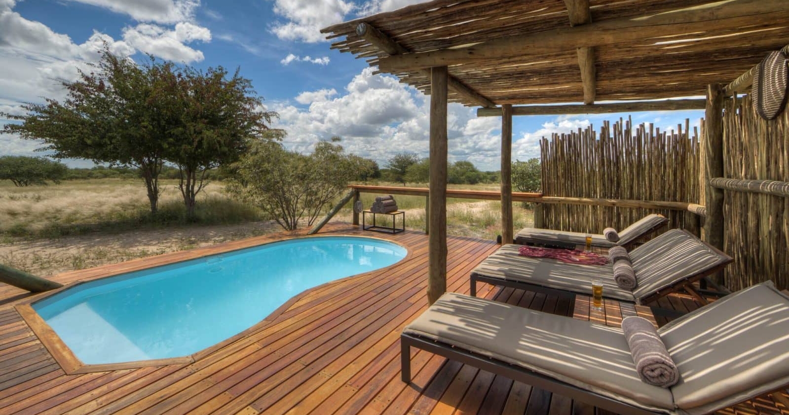 I tillegg til de romslige teltene har overnattingsstedet flere innbydende fellesområder for avslapning og sosialt samvær, som lounge og bar, bålplass og et bassengområde. Dinaka Camp tilbyr en kombinasjon av komfort, avskjermethet og ekte villmarksopplevelse. Her får du muligheten til å oppleve det stille, vakre Kalahari-landskapet og observere dyrelivet på nært hold.