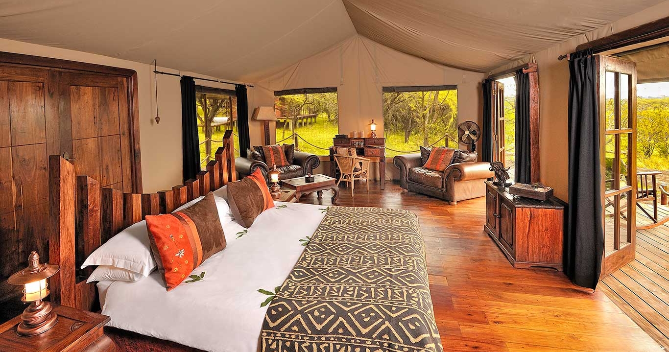 De store, romslige og elegante teltene er bygget på treplattformer. I tillegg til komfortable senger og bad, er det også utendørs dusj. Alle teltene har en stor og romslig veranda, hvor du kan se utover Serengetis uendelige sletter.
