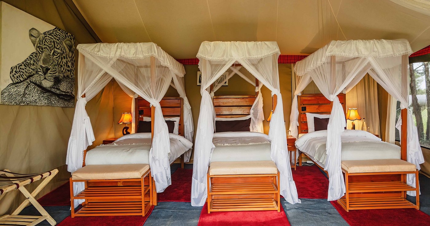 De store, romslige og elegante teltene er bygget på treplattformer. I tillegg til komfortable senger og bad, er det også utendørs dusj. Alle teltene har en stor og romslig veranda, hvor du kan se utover Serengetis uendelige sletter.