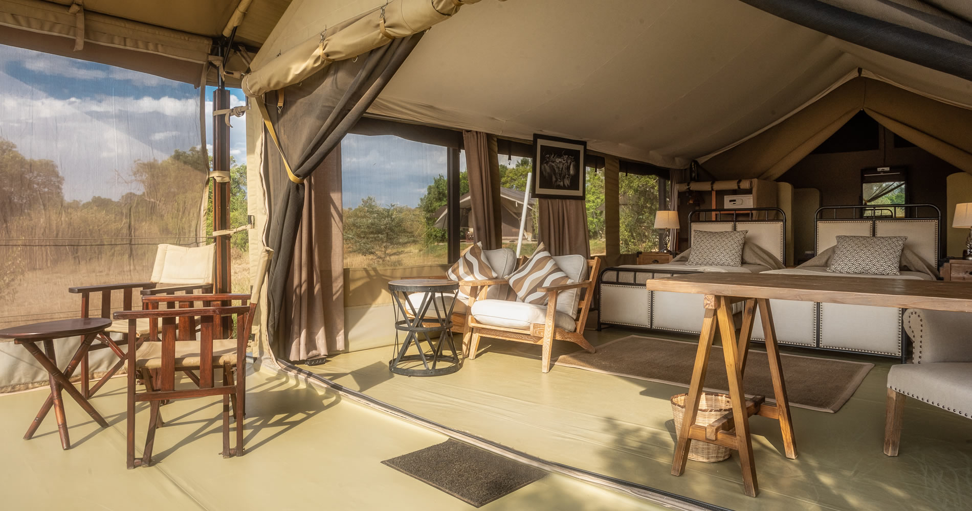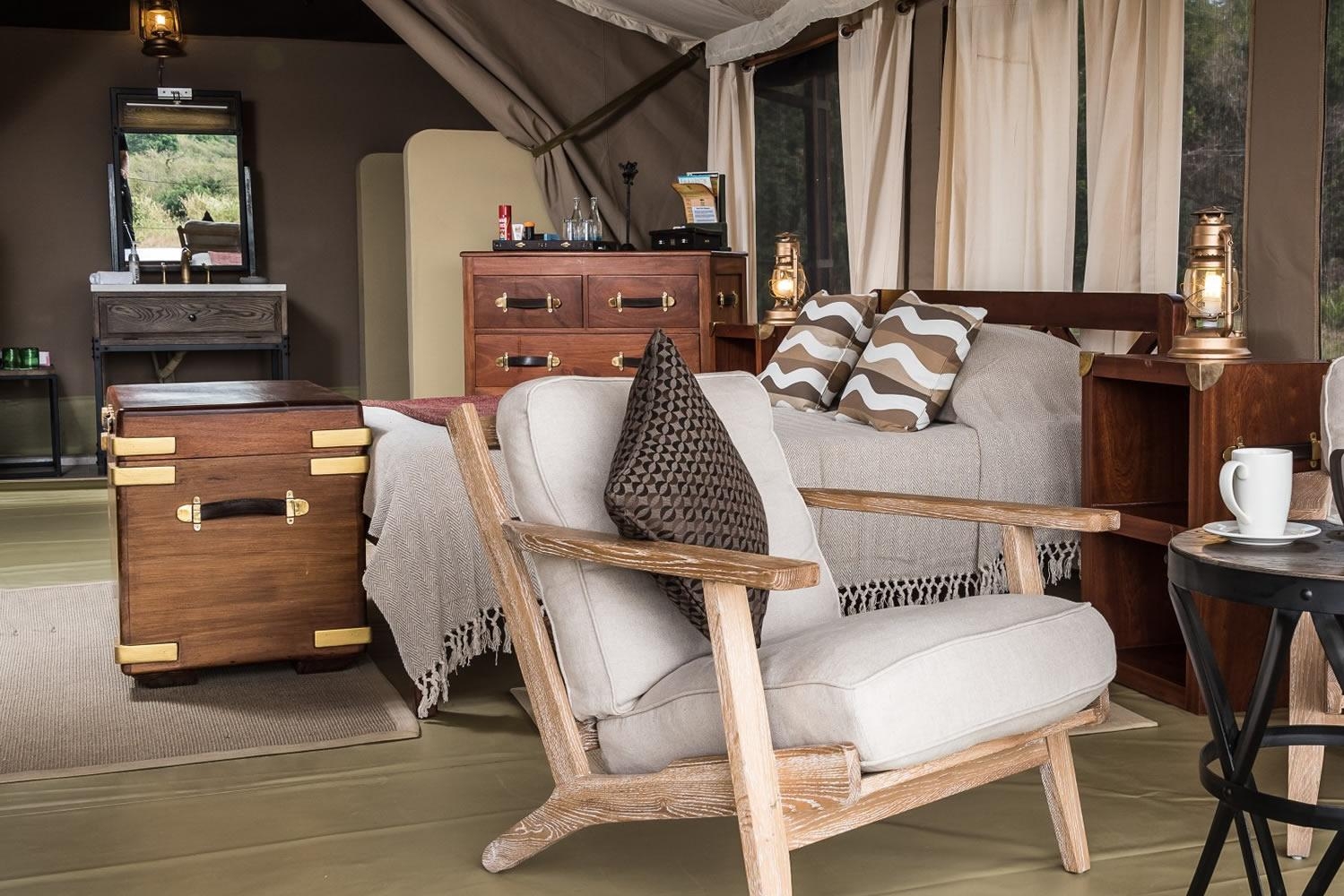 Den autentiske innredningen gjenspeiler safarieventyrene fra 1920-tallet og suppleres med moderne komfort, inkludert et evighetsbasseng med utsikt over elven. Med bare 16 telt, inkludert ett større familietelt, tilbyr campen en eksklusiv og privat opplevelse og ønsker gjester i alle aldre velkommen.