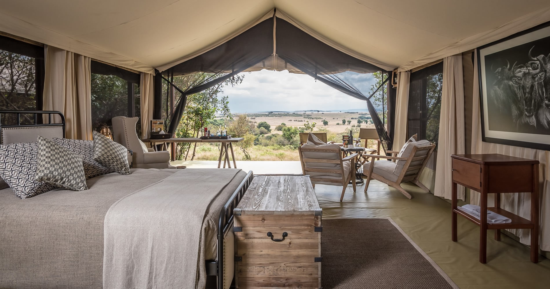 De luksuriøse og vakkert innredede teltene har egne bad og er hevet på tredekk med utsikt over elven Mara. Entim-opplevelsen handler om å være en del av landskapet og få dype møter med ville dyr og Masaifolket i deres eget land.