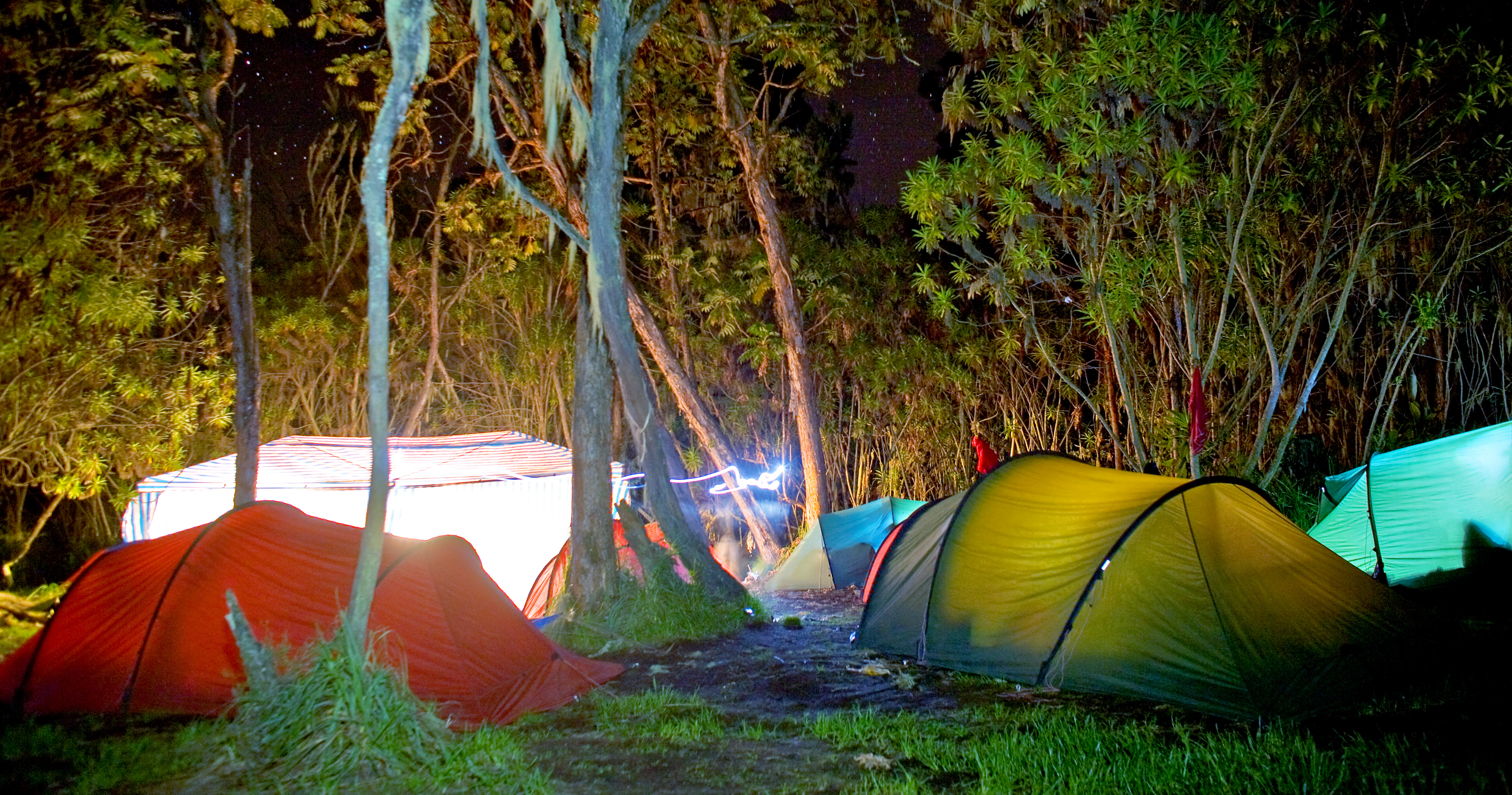 Hyttene er en fordel fordi de gir litt ekstra varme om kveldene og gir bedre beskyttelse mot været enn teltene. Kjøkken og toalett er i separate hytter.