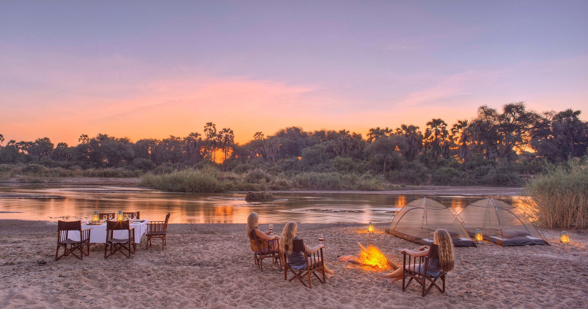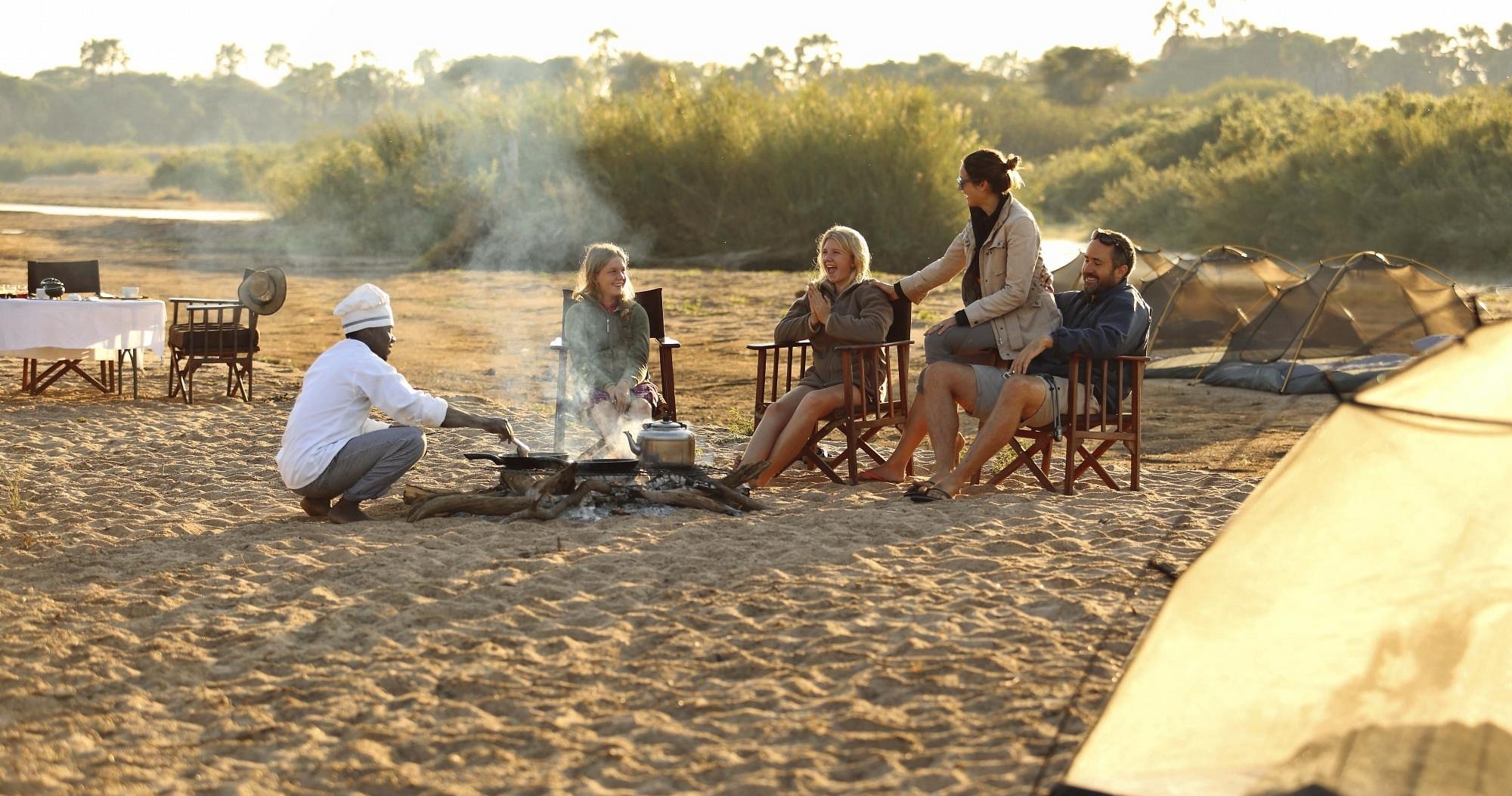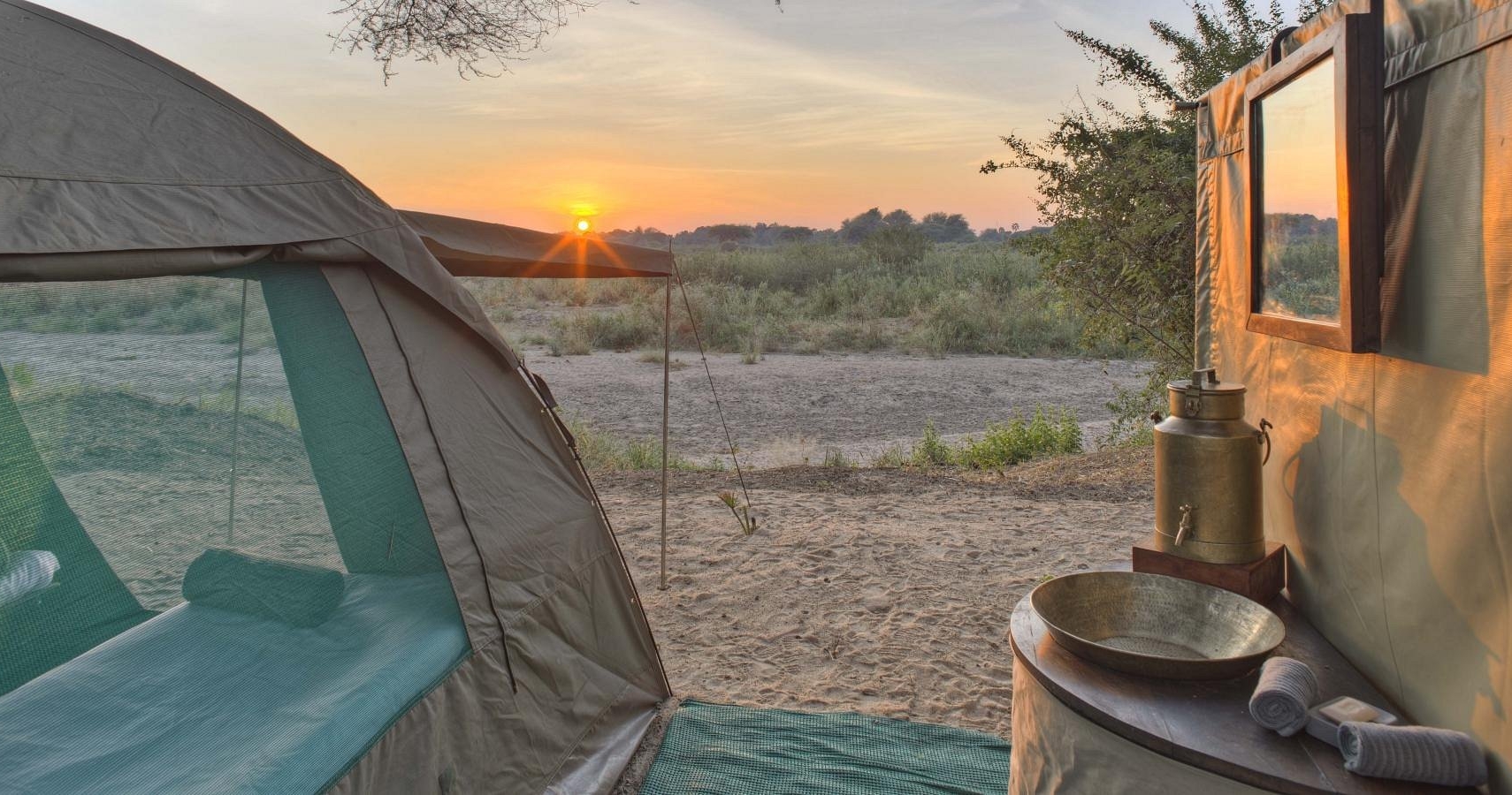Dere setter opp leir, vanligvis langs elvenes bredder eller nedsenket i de nærliggende skogene, og bor i telt midt i villmarken. Hvert telt har sin egen bøttedusj og egen utedo. Dette er en safariopplevelse utover det vanlige!