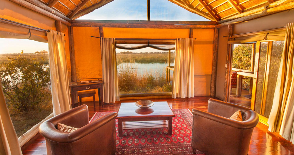 Lagoon Camp, som ligger ved bredden av Kwando-elven, tilbyr en intim opplevelse med bare ni telt, alle utstyrt med bad, innendørs og utendørs dusjer, og en privat terrasse med utsikt over elven.