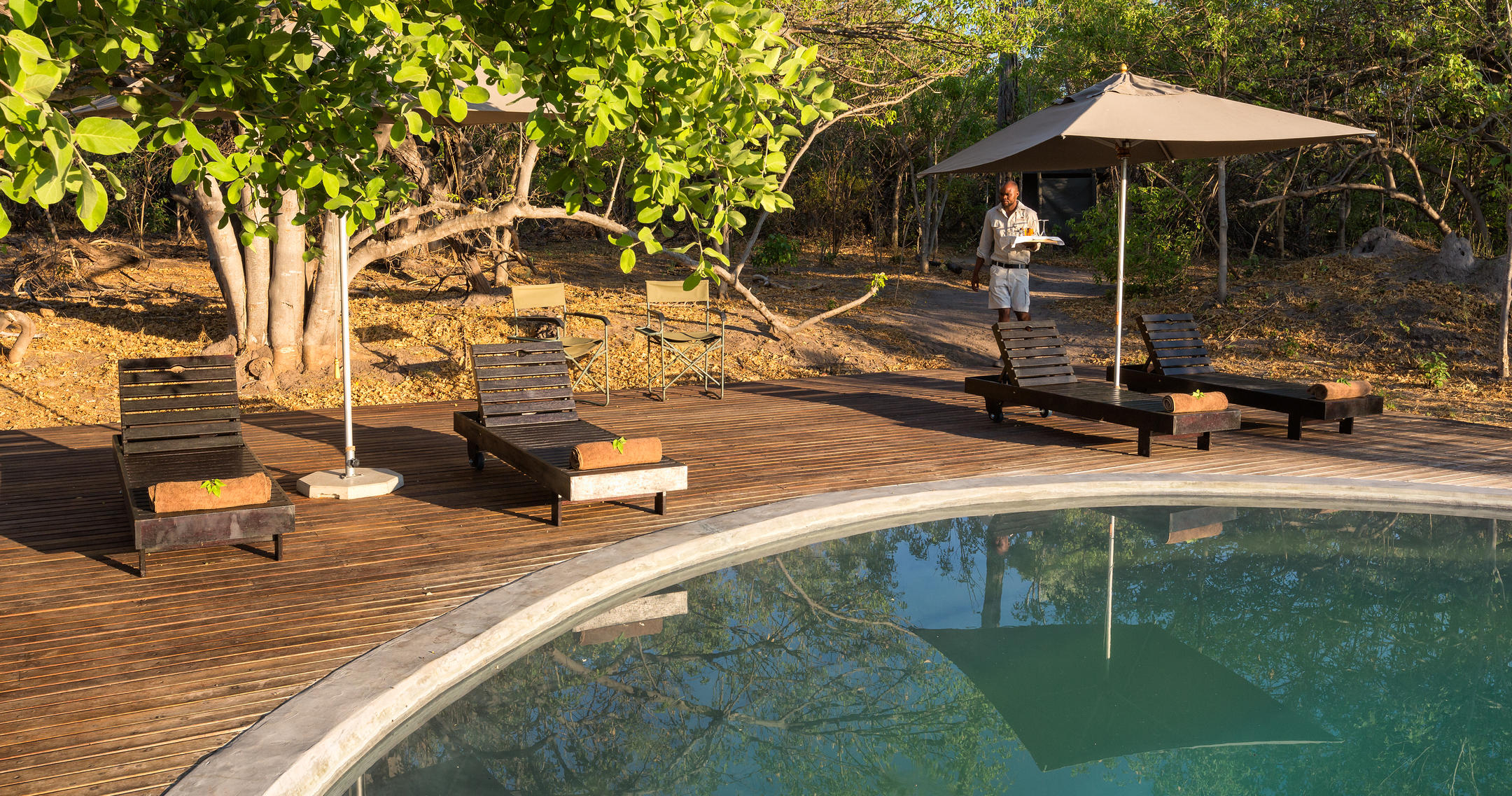 Utforsk Okavango Delta eller len deg tilbake og nyt utsikten og roen, enten fra bassenget eller fra din private balkong. Kveldene avsluttes med middag under stjernehimmelen og åpent bål. Et opphold du sent vil glemme.