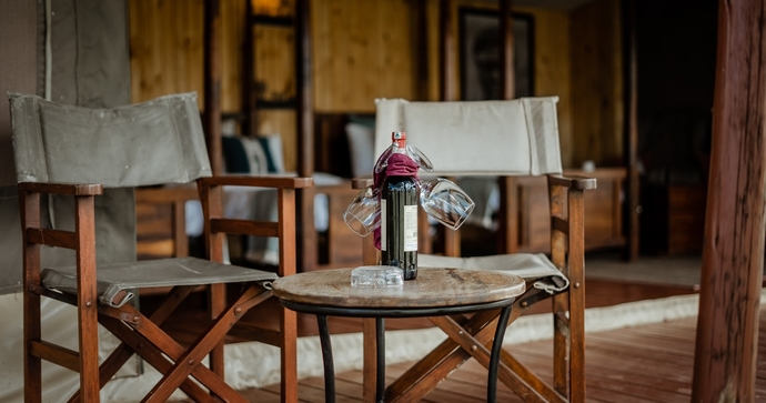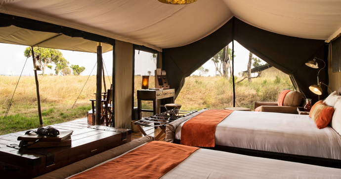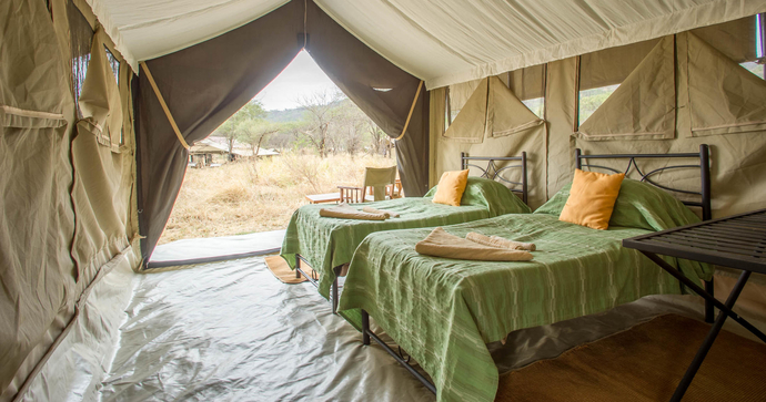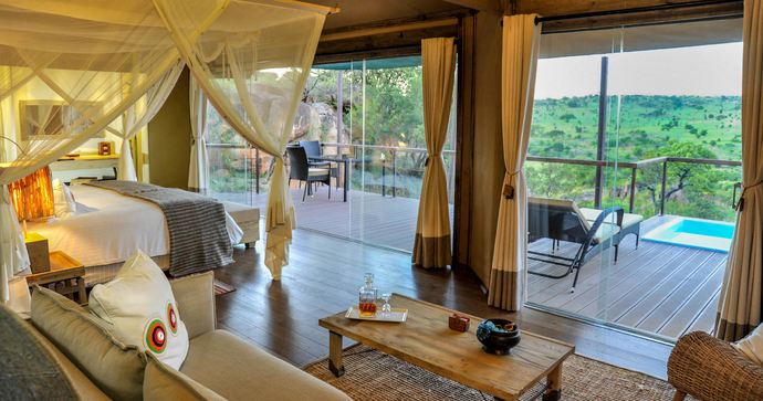 De store, romslige og elegante teltene er bygget på treplattformer. I tillegg til komfortable senger og bad, er det også utendørs dusj. Alle teltene har en stor og romslig veranda, hvor du kan se utover Serengetis uendelige sletter.