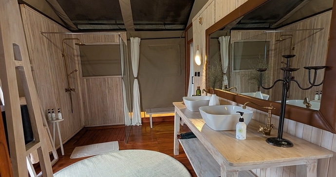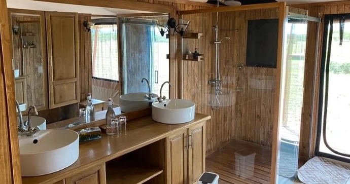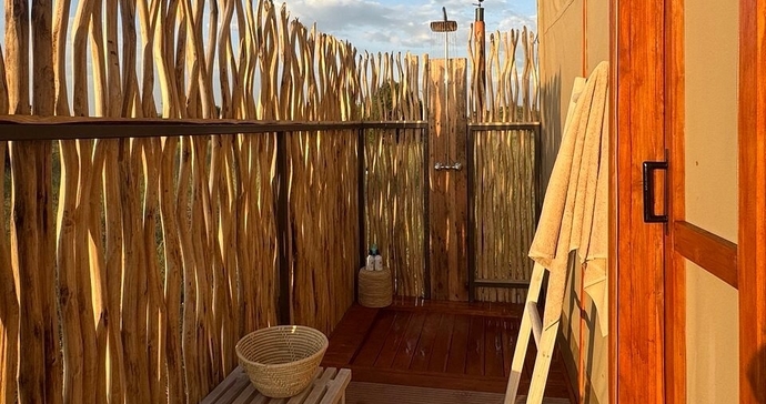 De romslige teltene står på hevede plattformer, og har privat veranda med utsikt over den omkringliggende savannen. Teltene har bad med dobbel servant, toalett og både innendørs og en unik utendørs dusj, som gir deg muligheten til å dusje bokstavelig talt under den afrikanske stjernehimmelen! Her kombineres komfort med naturopplevelse.