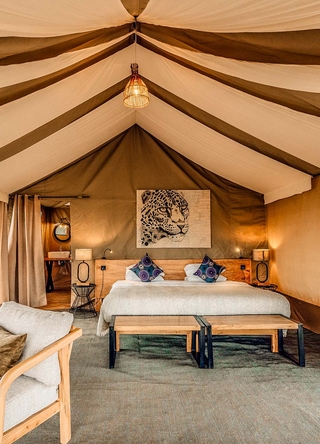 Leiren består av smakfullt innredede telt som skaper en herlig safarifølelse. De romslige teltene har komfortable senger, toalett, dusj og en stor veranda med utsikt over savannen.