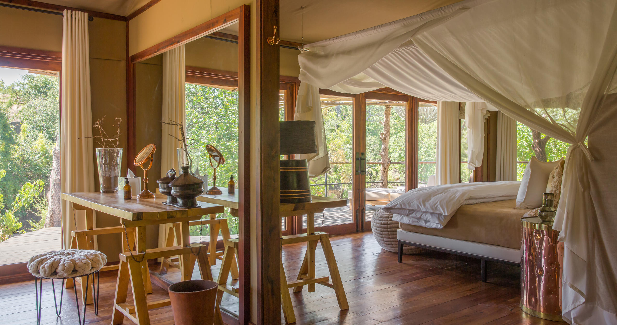 Her finnes kun 12 luksuriøse telt som tilbyr privatliv, komfort og panoramautsikt. Hvert telt er romslig og elegant innredet med moderne bekvemmeligheter og tradisjonell afrikansk design, inkludert eget bad, privat veranda og sitteområder.