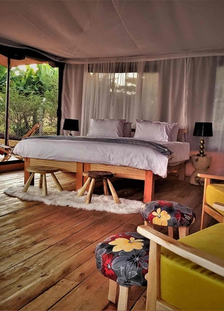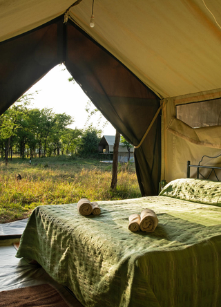 Teltene er fullt utstyrt med bad, elektrisk belysning, myggnett og en komfortabel seng. Dette er det perfekte overnattingsstedet for deg som ønsker et elegant og sjarmerende opphold i Serengeti.