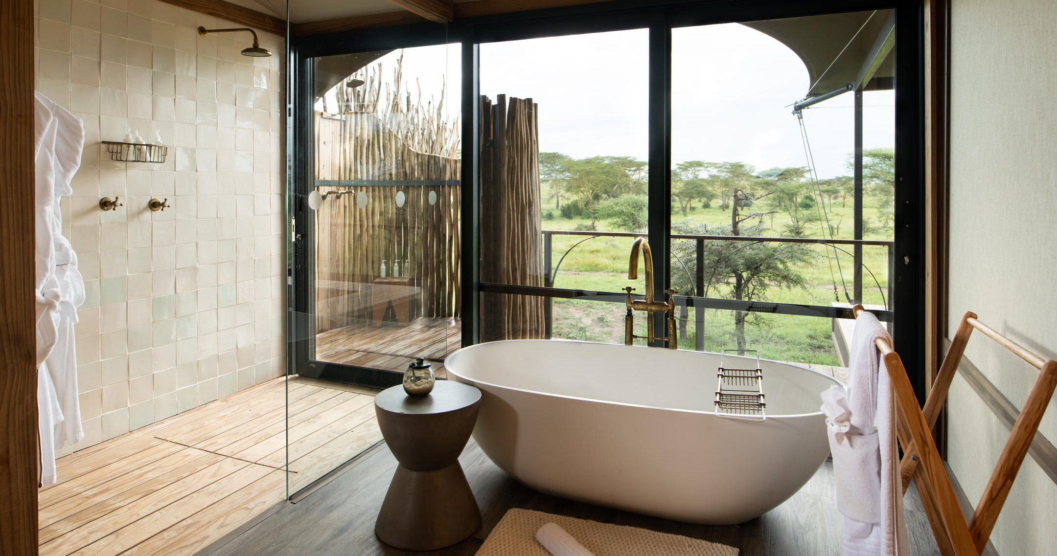 De store, romslige og elegante teltene er bygget på treplattformer. I tillegg til komfortable senger og bad, er det også utendørs dusj. Alle teltene har en stor og romslig veranda, hvor du kan se utover Serengetis uendelige sletter.