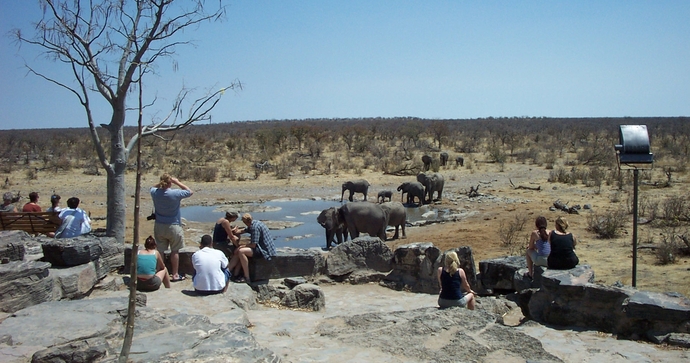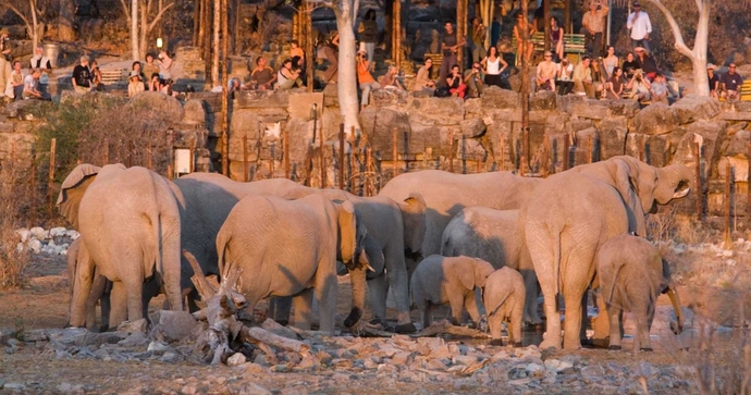 Området er flombelyst om natten, slik at gjestene kan nyte mangfoldet av dyreliv rundt Okaukuejo Camp.