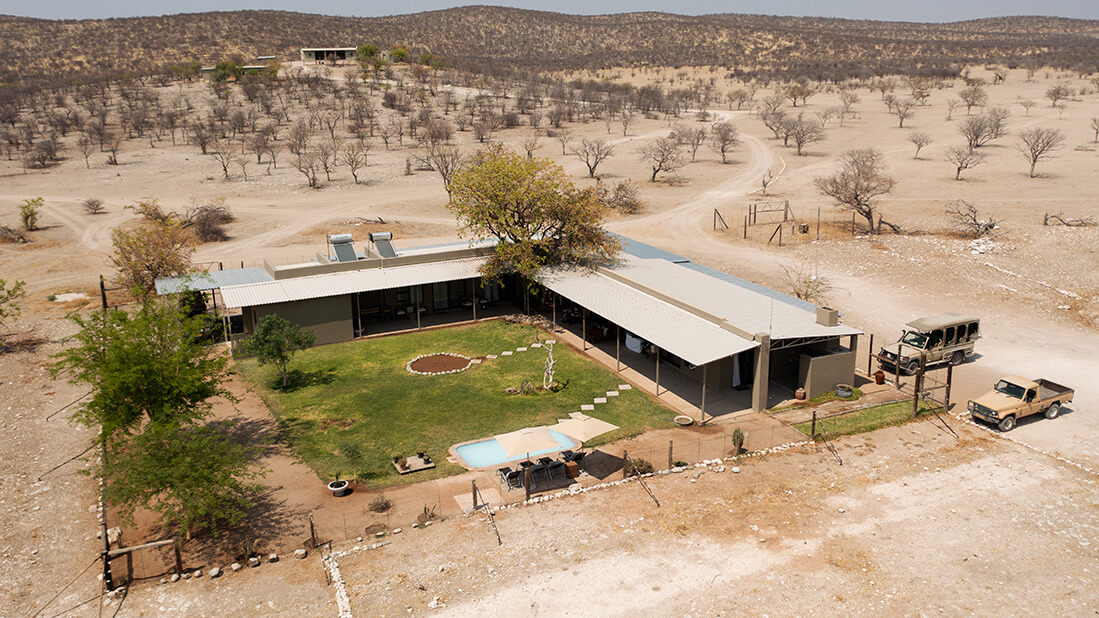 Villaen har en privat guide og et safarikjøretøy for skreddersydde safariopplevelser. Med hjemmekoselige fasiliteter og et lite basseng er det det perfekte stedet for deg som søker et privat og avslappende opphold i Namibias villmark.