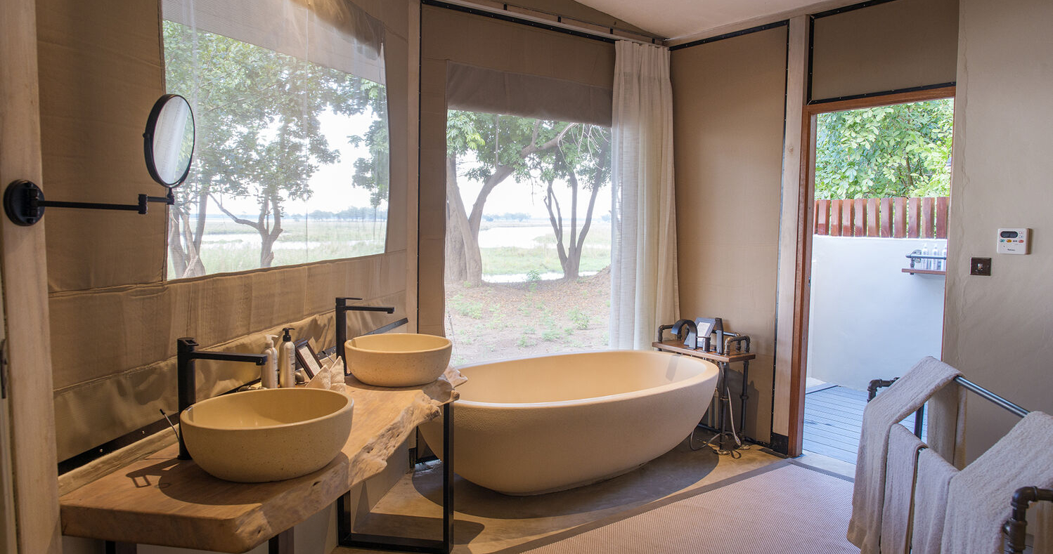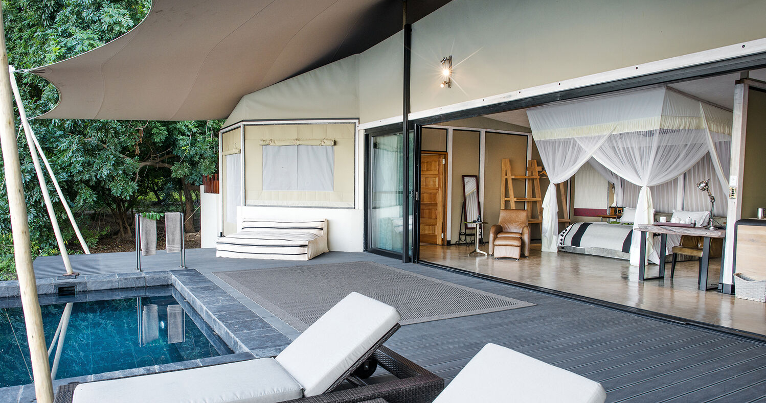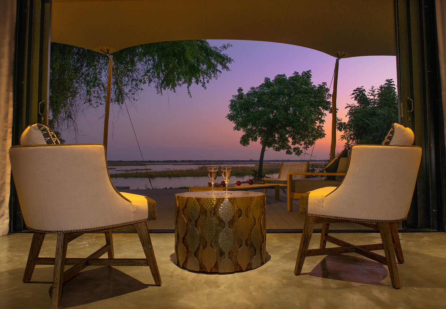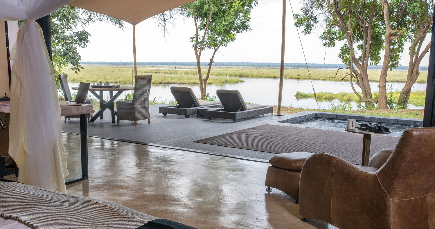 Hver suite har store vinduer av glass og skyvedører, og er skygget av modne pølse- og mahognitrær, noe som skaper en kjølig og privat følelse. Her kan du nyte en uforglemmelig utsikt over elven direkte fra din suite, ofte i selskap med elefanter og andre ville dyr.