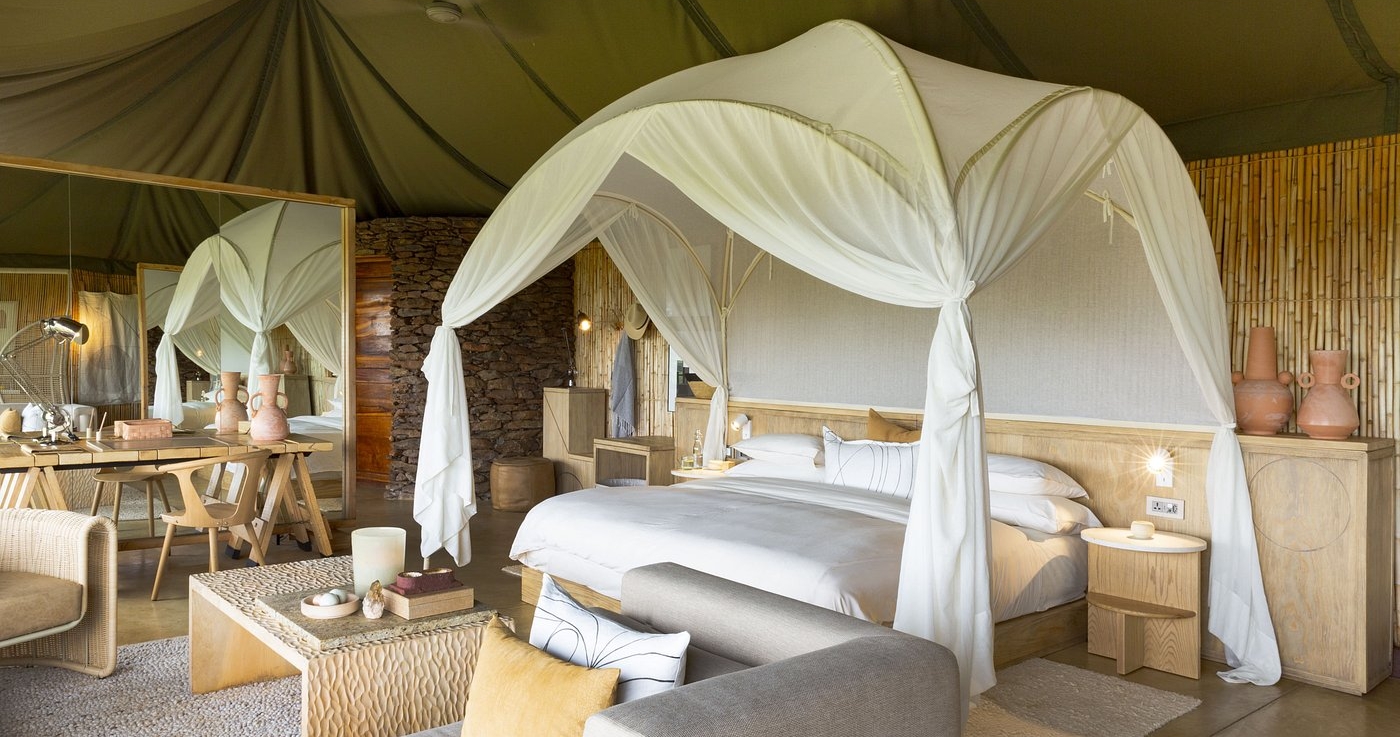 Her finnes kun 12 luksuriøse telt som tilbyr privatliv, komfort og panoramautsikt. Hvert telt er romslig og elegant innredet med moderne bekvemmeligheter og tradisjonell afrikansk design, inkludert eget bad, privat veranda og sitteområder.