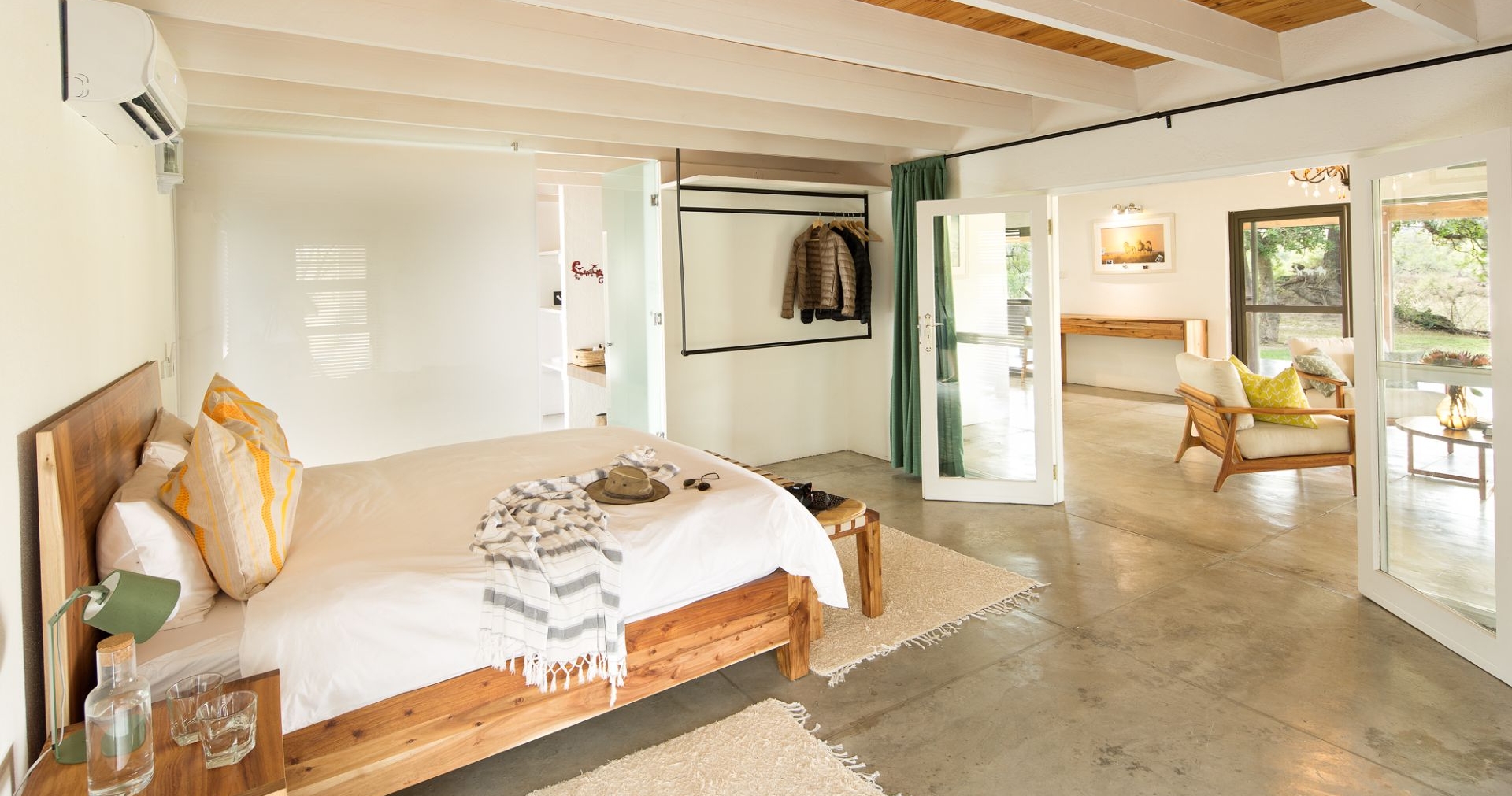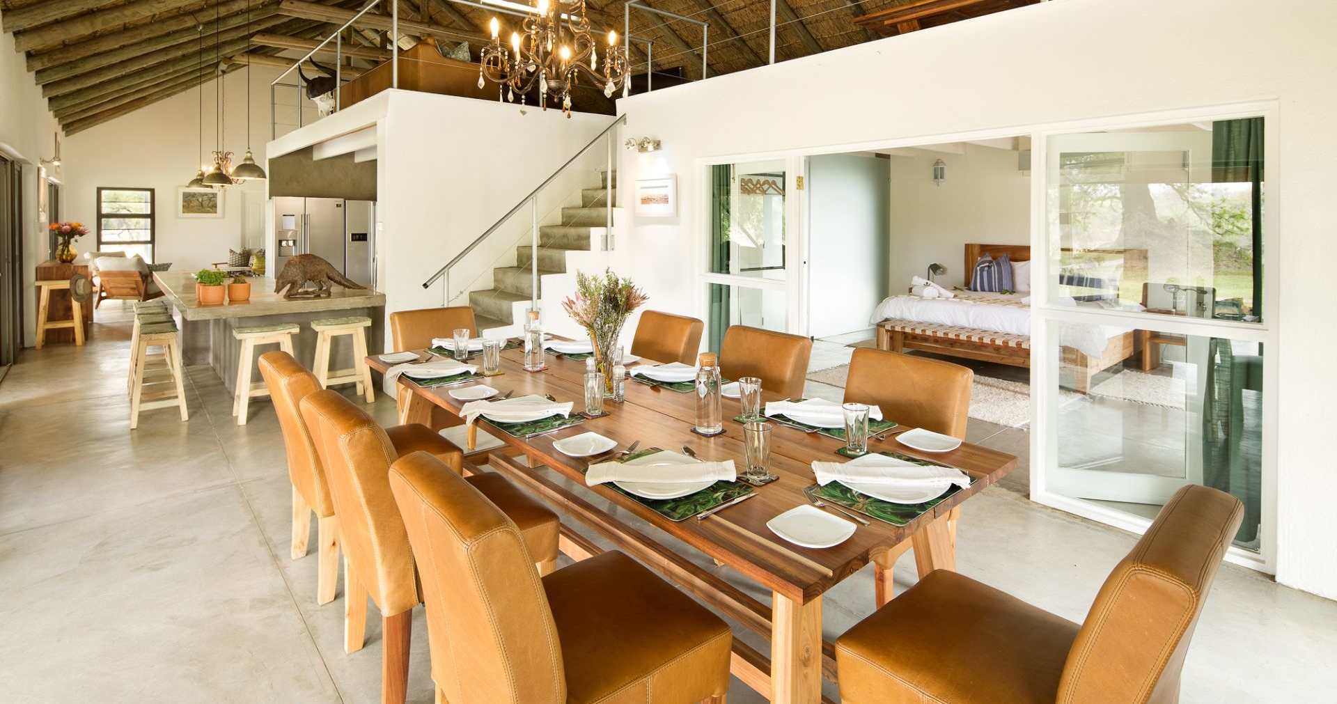 Lodgen består av 13 suiter og en privat villa, alle designet med moderne arkitektur som smelter sammen med omgivelsene. Suitene er romslige med glassvegger som maksimerer utsikten. For deg som ønsker å oppleve den afrikanske stjernehimmelen på en ekstra spesiell måte, finnes det terrasser med utendørsenger.