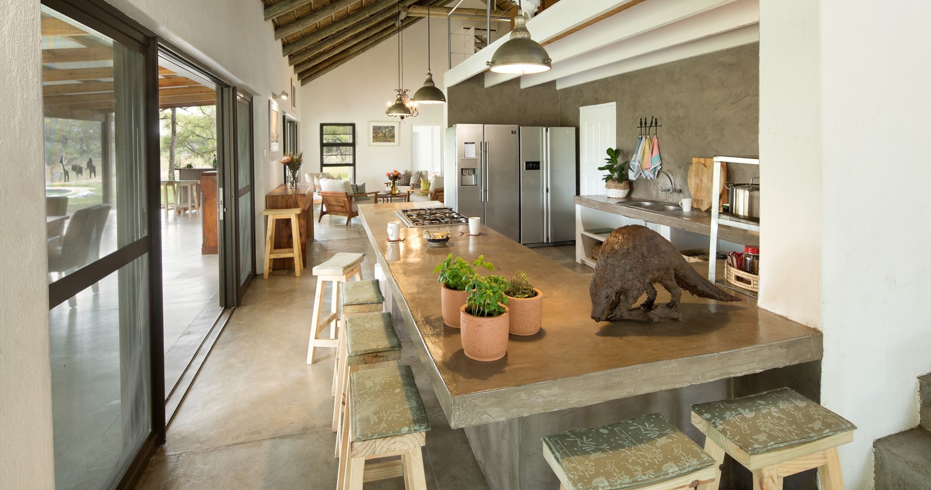 Kjøl deg ned i det 20-meter lange evighetsbassenget som hjelper til med å bekjempe de varme somrene, mens den store peisen inne skaper en koselig atmosfære for kjøligere kvelder. Møt kvelden under stjernehimmelen rundt bålet.