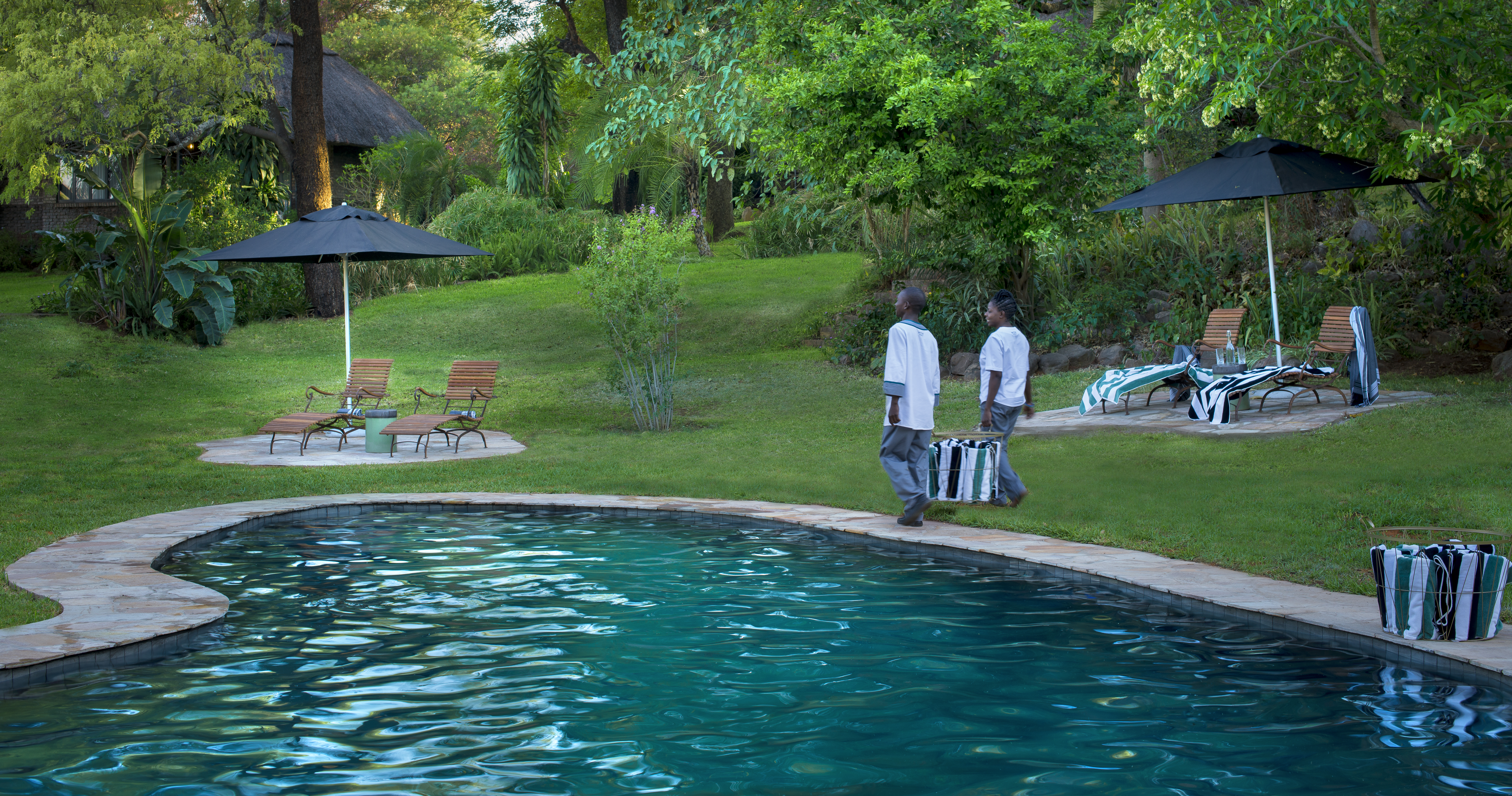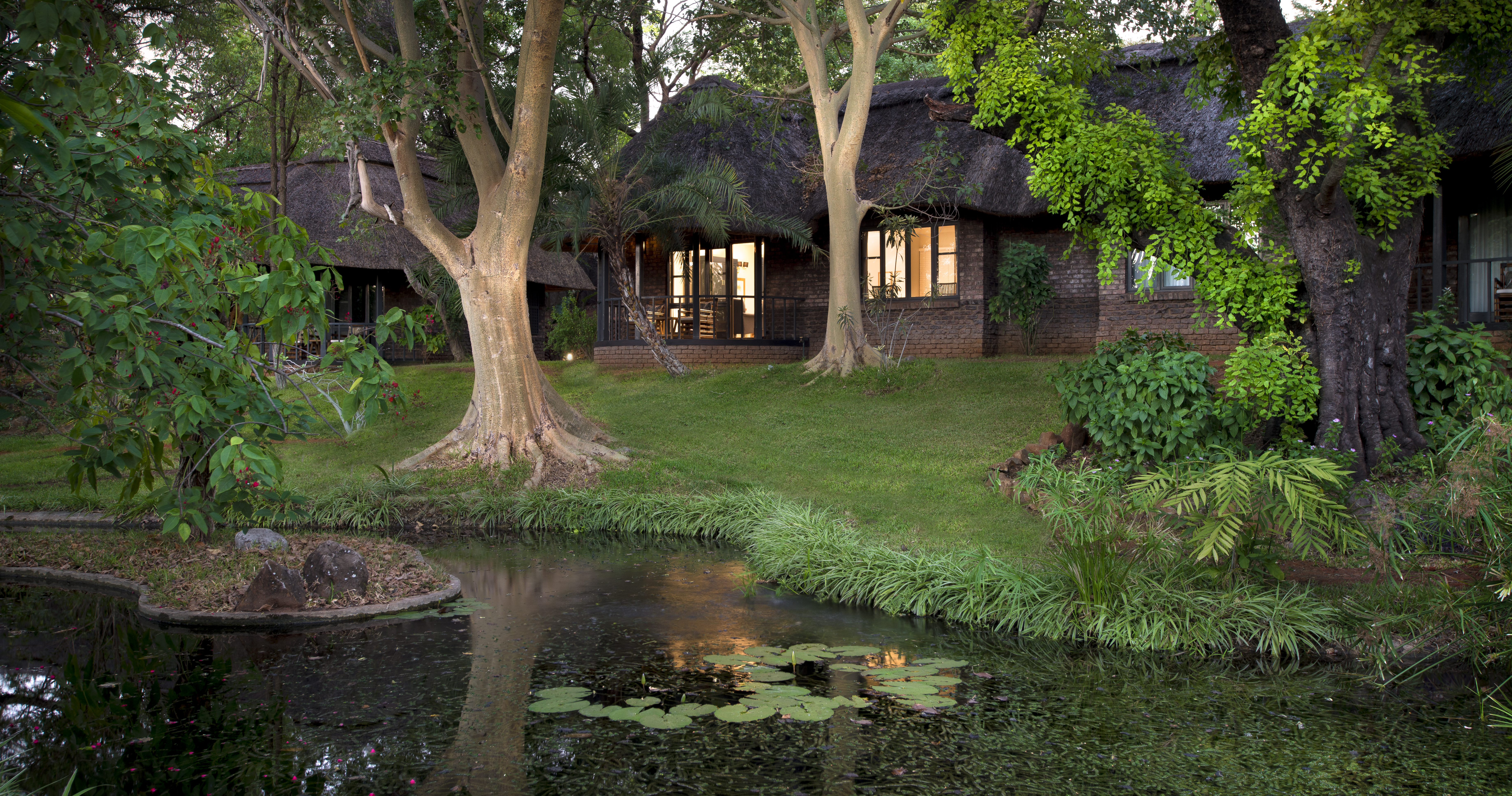 Her råder det ro og harmoni. Med to bassenger, et spa og en frodig hage er det gode muligheter for avslapning mellom dine safarieventyr.